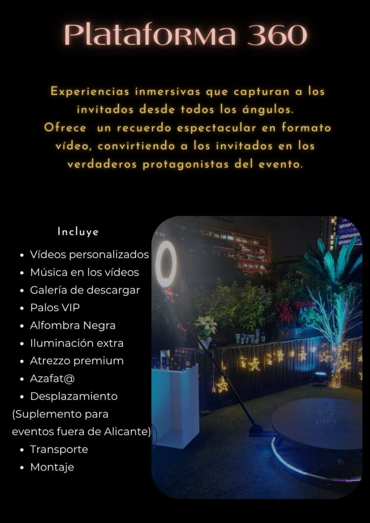 Uno de nuestros servicios estrella es el Aéreo 360, una plataforma giratoria que graba vídeos en 360 grados mientras tú y tus invitados posan, bailan o simplemente se lo pasan en grande. Es divertido, moderno y totalmente viral. ¡Tus redes sociales no volverán a ser las mismas! Este servicio no solo añade un toque innovador, sino que garantiza risas, emoción y contenido espectacular para recordar ese gran día.